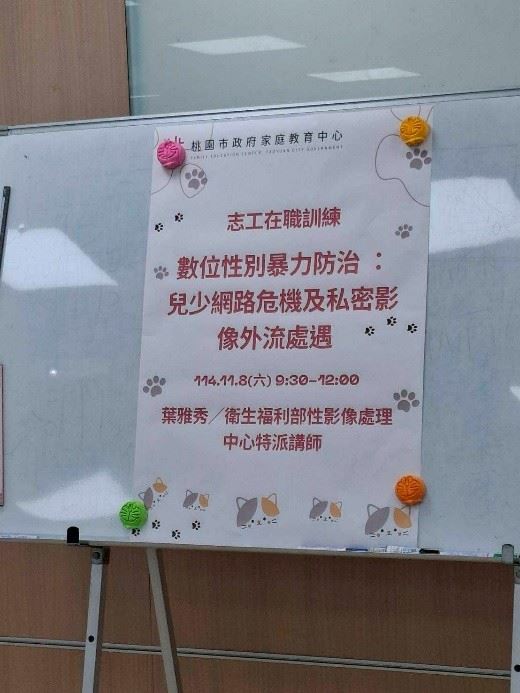 主辦單位:桃園市政府家庭教育中心課程/活動日期:志工在職訓練114.11.8課程/活動名稱:數位性別暴力防治 :兒少網路危機及私密影像外流處遇課程/活動對象:中心志工辦理形式:課程課程/活動簡介(大綱):兒少面臨的網路危機秘密影像外流處遇參加人數:共30人,分別為男性:3人;女性:27人;其他0人講師資料:(1)姓名:葉雅秀(2)職稱:衛生福利部性影像處理中心特派講師